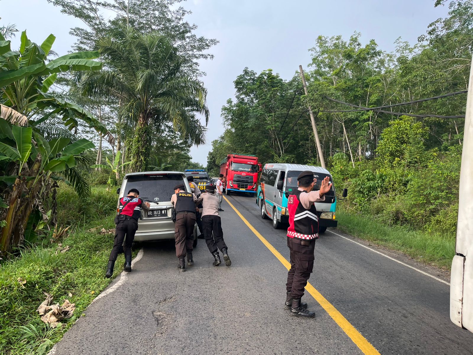 Pada kesempatan itu, Kami saat sedang berpatroli bertemu mesin mobil mini bus mengalami kerusakan sedangkan posisinya di tengah jalan. Lalu Polisi yang bertugas bergegas membantu supaya tak mengganggu arus lalulintas.