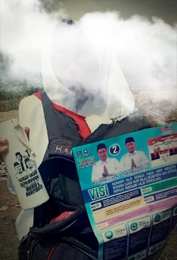 “Ada,” kata siswa sembari mengeluarkan logistik pemilu berupa selebaran visi-misi yang bergambar Paslon Cabub dan cawabub Inhil nomor urut 2.