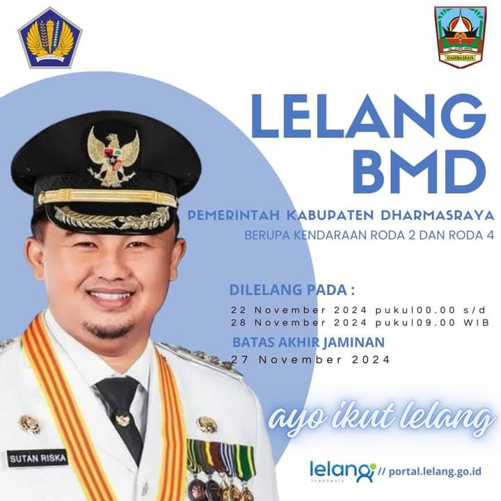 Dharmasraya,kabarmedianews -Pemerintah Kabupaten Dharmasraya melalui perantara Kantor Pelayanan Kekayaan Negara dan Lelang (KPKNL) Padang, akan melaksanakan lelang Non Eksekusi Wajib Barang Milik Daerah (BMD) dengan objek lelang berupa Kendaraan Dinas Operasional/Jabatan dan Scrap/Besi Tua yang sudah tidak digunakan lagi untuk operasional berupa Kendaraan roda 2 dan roda 4, pelaksanaan lelang pada tanggal 22 November 2024 pukul 00.00 s.d 28 November 2024 pukul 09.00. Adapun batas akhir jaminan pada hari Rabu tanggal 27 November 2024.