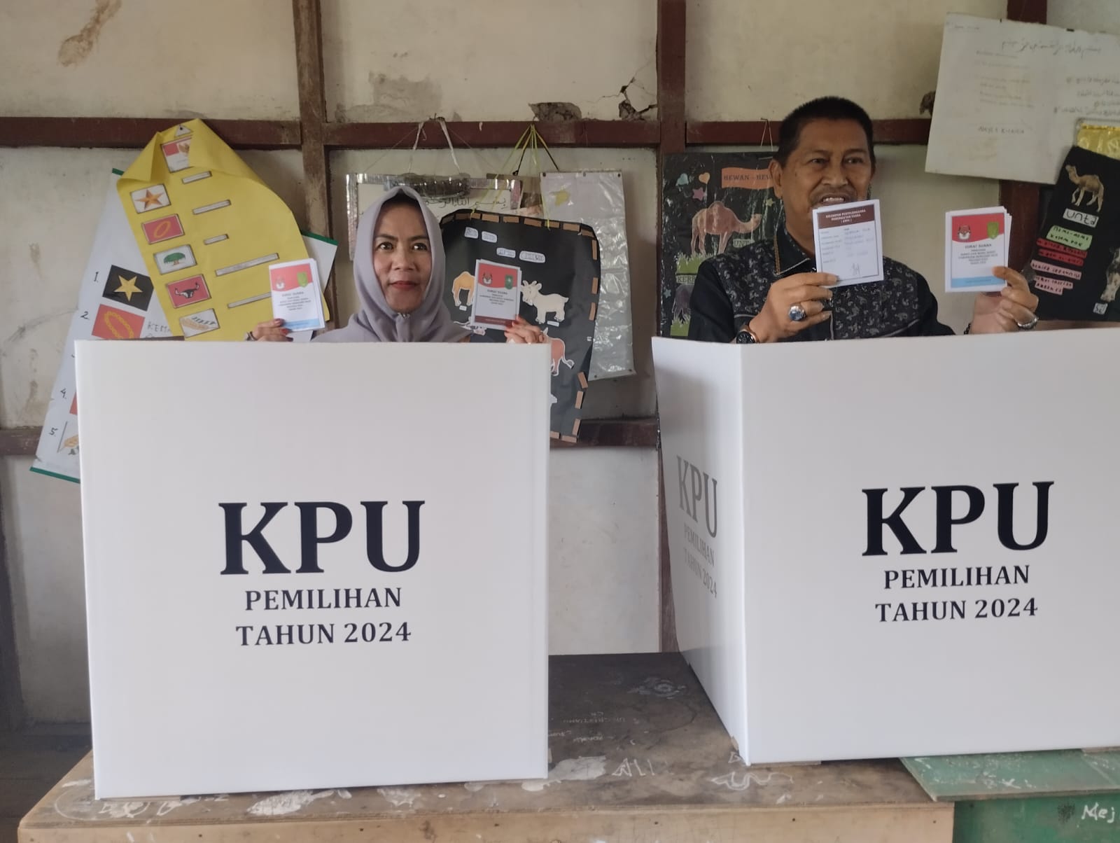 Syamsudin Uty atau disebut Abah SU mengenakan ciri khasnya dengan menggunakan baju batik hitam tampak didampingi sang istri menyalurkan hak pilihnya.