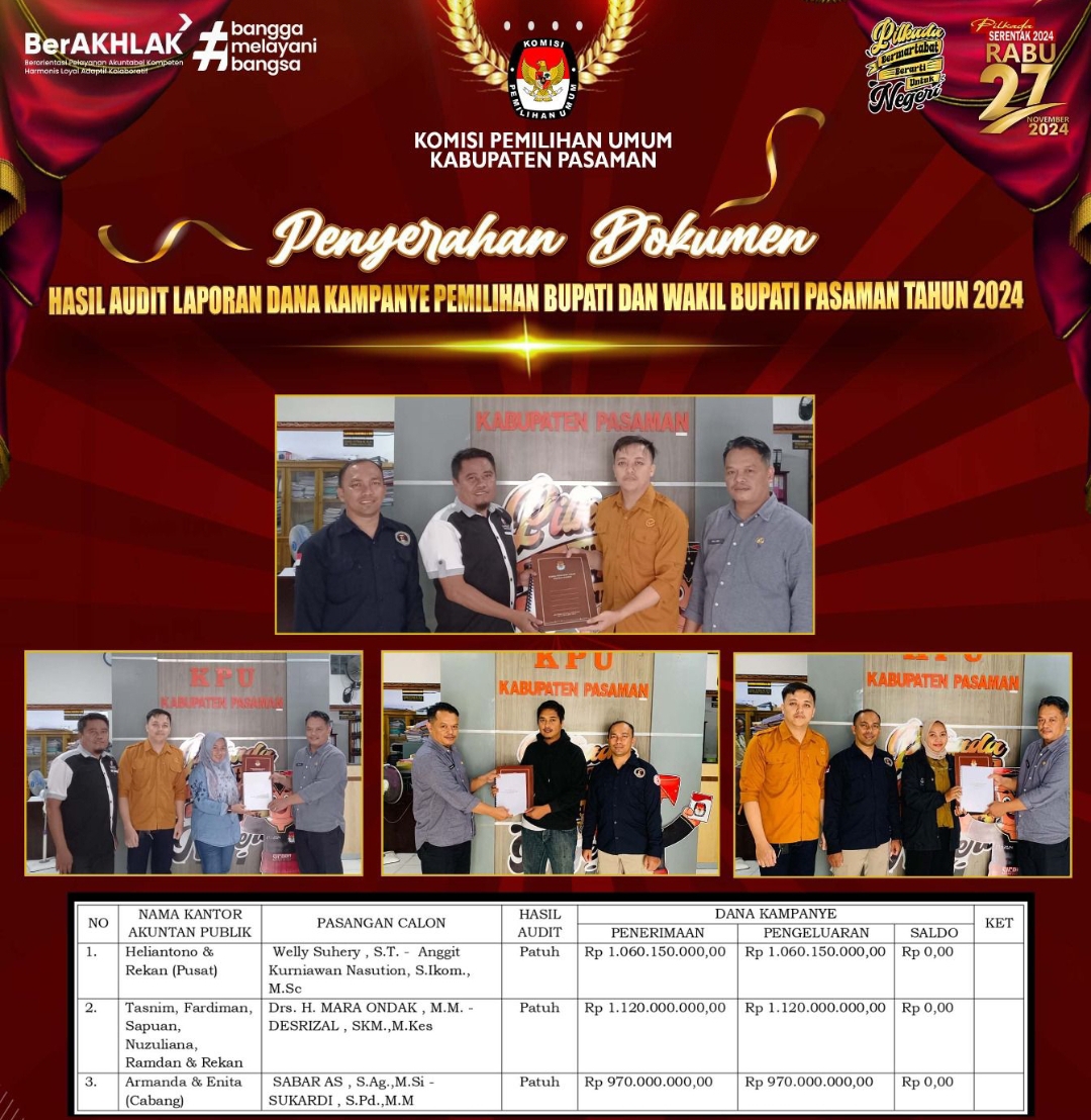 Berdasarkan hasil audit dana kampanye, terhadap ketiga pasangan calon (paslon) Bupati dan Wakil Bupati Pasaman 2024 dinyatakan, bahwa semua pasangan calon (01 Welly Suheri-Anggit Kurniawan Nasution, 02 Mara Ondak-Desrizal, 03 Sabar AS-Sukardi) dinyatakan patuh.