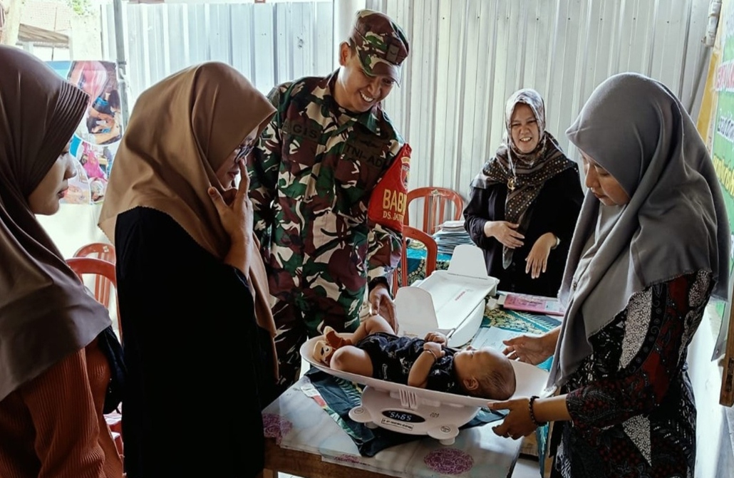 Kegiatan kali ini babinsa melaksanakan pendamping kepada tenaga kesehatan dan kader Posyandu dengan sasaran penimbangan berat badan, mengukur tinggi badan untuk mengetahui perkembangan dan pertumbuhan bayi serta pemberian vitamin kepada Balita untuk mencegah Stunting.