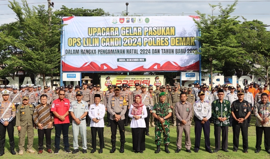 Demak – Polres Demak melaksanakan apel gelar pasukan dalam rangka operasi lilin Candi tahun 2024 di Lapangan Wicaksana Laghawa Polres Demak, Jum’at (20/12/2024)