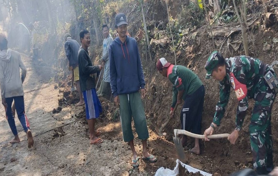 Blitar – Bintara Pembina Desa (Babinsa) Tapakrejo Koramil 0808/14 Kesamben Kodim 0808 Blitar Serda Anjas, bersama warga Desa Tapakrejo mengadakan kerja bakti bahu- membahu untuk membersihkan jalan kampung dan parit bertempat di Dusun Sumbermangku, Desa Tapakrejo Kecamatan Kesamben Kab. Blitar, Sabtu (28/12/2024).