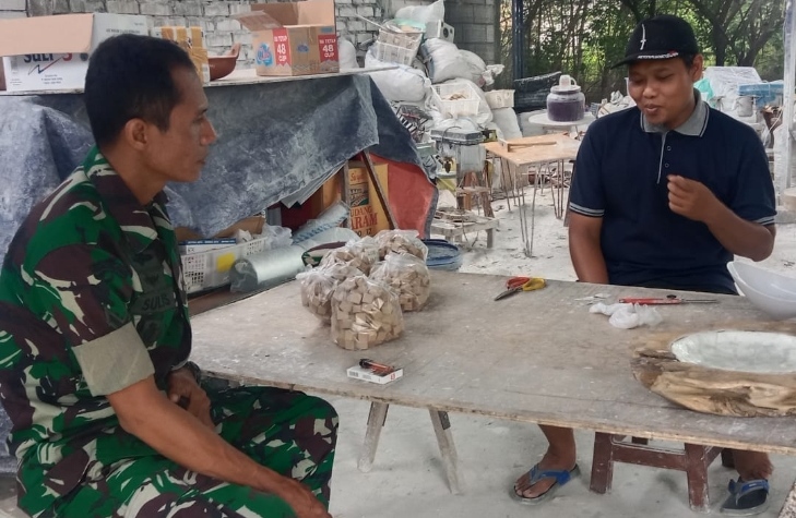 Gresik – Babinsa Koramil 0817/12 Kota Gresik, Serda Sulis, melaksanakan kegiatan komunikasi sosial (Komsos) dengan Bapak Khosim, pemilik usaha pengolahan kulit kerang menjadi berbagai produk kerajinan di Desa Purwodadi, Kecamatan Sidayu, Kabupaten Gresik.minggu (29/12/2024)