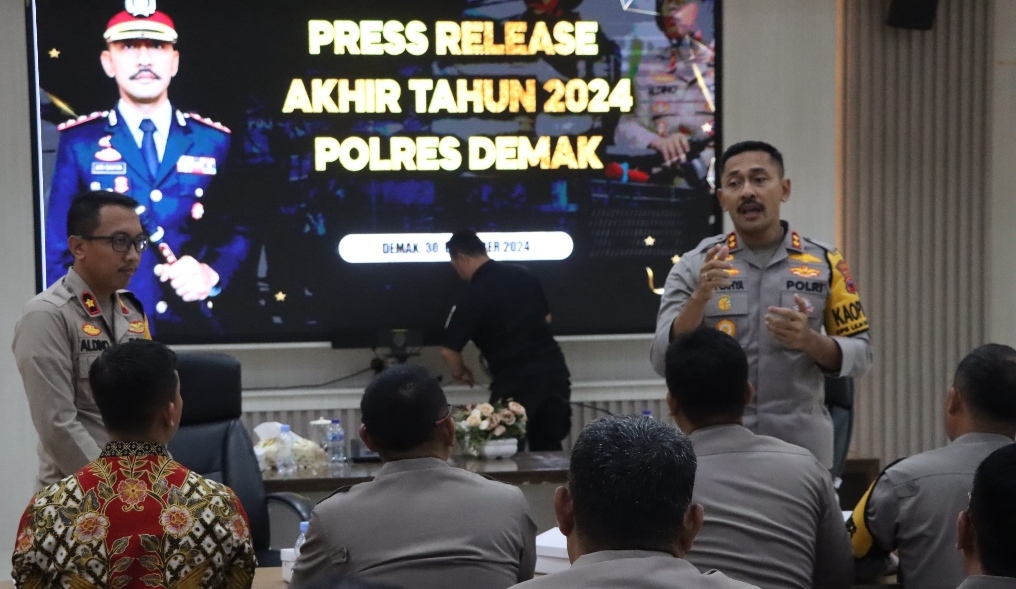 Demak, – Kepala Kepolisian Resor Demak AKBP Ari Cahya Nugraha didampingi oleh Wakapolres Kompol Aldino dan PJU Polres Demak menyampaikan Rilis Akhir Tahun 2024 di Aula Wicaksana Laghawa Polres Demak (30/12/2024).