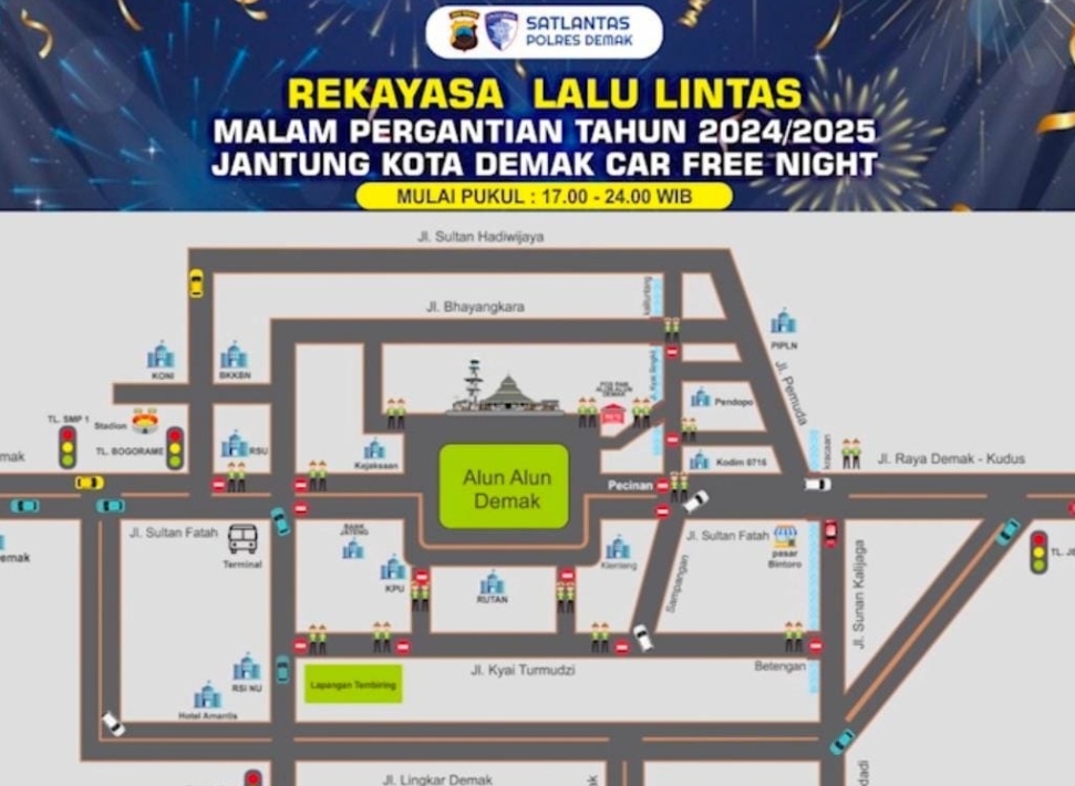Polres Demak News – Polres Demak menyiapkan skenario pengalihan arus lalu lintas di sekitar kawasan jantung Kota Demak di Alun- alun Demak pemberlakuan malam bebas kendaraan bermotor atau Car Free Night (CFN) pada malam pergantian tahun 2025 pada Selasa, 31 Desember 2024.