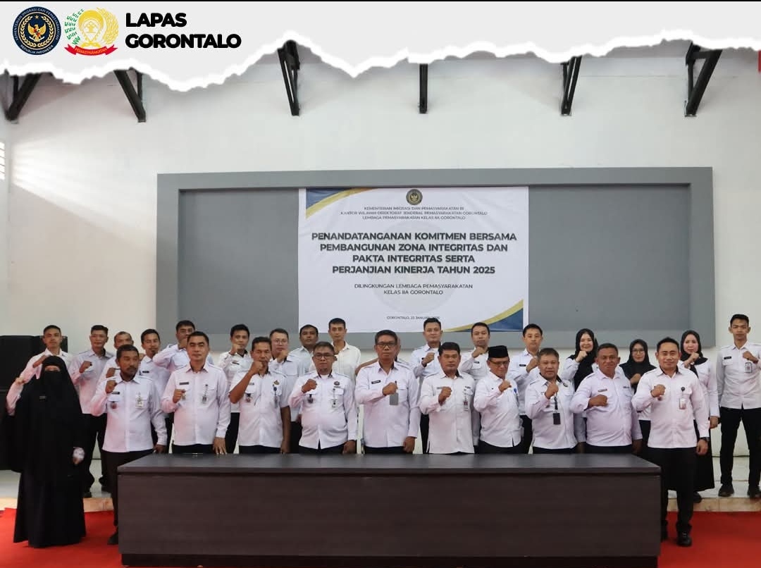 Gorontalo– Lembaga Pemasyarakatan (Lapas) Kelas IIA Gorontalo menggelar penandatanganan komitmen bersama pembangunan Zona Integritas menuju Wilayah Bebas dari Korupsi (WBK) dan Wilayah Birokrasi Bersih dan Melayani (WBBM). Kegiatan ini merupakan tindak lanjut dari arahan Kepala Kantor Wilayah Direktorat Jenderal Pemasyarakatan Gorontalo, Kamis (23/1/2025).