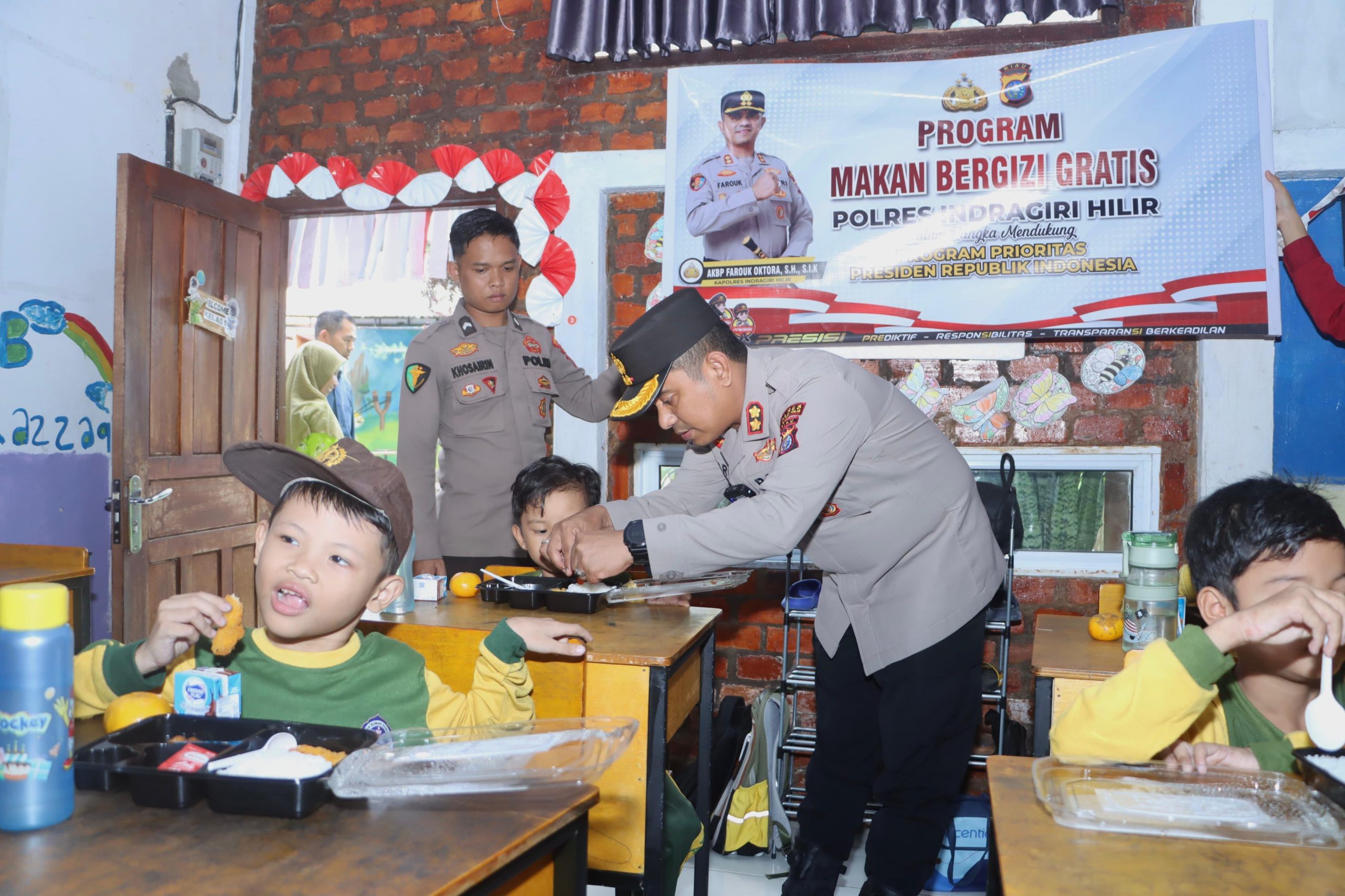 “Hari ini kami dari Polres Inhil hadir untuk memberikan makan siang bagi siswa SD IT Ziqra. Ini dalam rangka mendukung program Presiden RI Prabowo Subianto,” kata Kapolres Inhil.