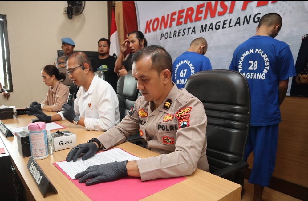 Konferensi Pers dipimpin oleh Kapolresta Magelang Kombes Pol Herbin Garbawiyata Jaya Sianipar, S.I.K., S.H. diwakili Kasatreskrim Kompol Muhammad Fachrur Rozi, S.H., S.I.K., M.H. Turut mendampingi kegiatan PS. Kasihumas Iptu Lilik Purwaka, S.Psi. dan Direktur Sahabat Perempuan, Putri Andhani Prabasasi, S.E.