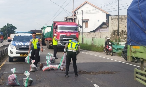 “Jalan berlubang menjadi salah satu faktor penyebab kecelakaan lalu lintas. Oleh karena itu, kami bersama tim bergerak cepat melakukan penandaan dan penambalan agar tidak menimbulkan bahaya bagi pengendara,” ujar AKP Engkos.