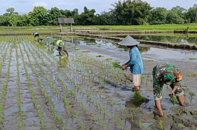 Dengan mengenakan pakaian lapangan Babinsa bersama petani turun ke sawah, ikut serta dalam proses penanaman padi secara tradisional. Kehadirannya di tengah petani tidak hanya sebagai bentuk pendampingan, tetapi juga memberikan motivasi agar para petani semakin semangat dalam mengolah lahan pertanian.