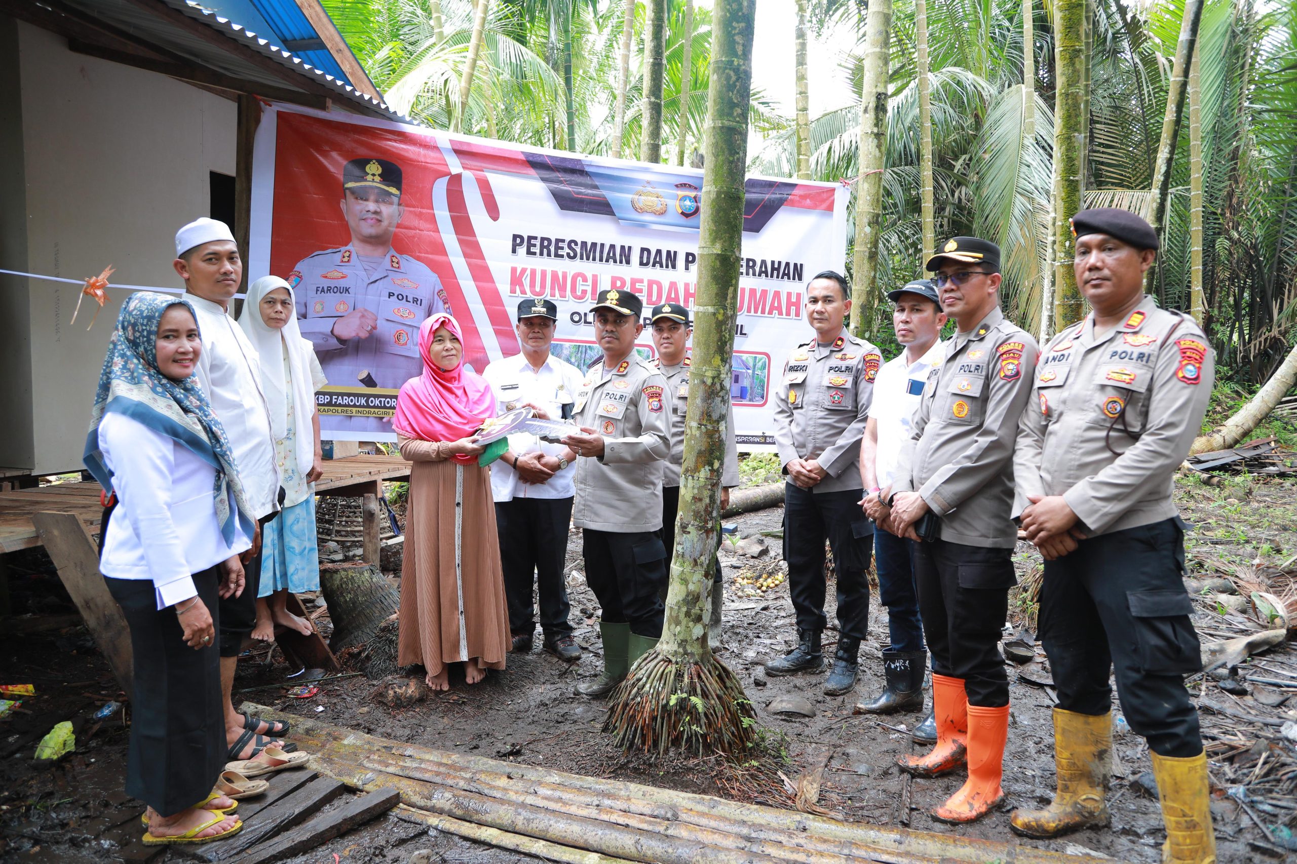 Kabarmedianews.com- Indragiri Hilir,- Kapolres Indragiri Hilir (Inhil), AKBP Farouk Oktora meresmikan dan menyerahkan kunci secara simbolis bantuan Bedah Rumah kepada ibu Jamilah (60), warga Jalan Sukadamai Kelurahan Sungai Salak, Kecamatan Tempuling, Rabu (26/2/2205).