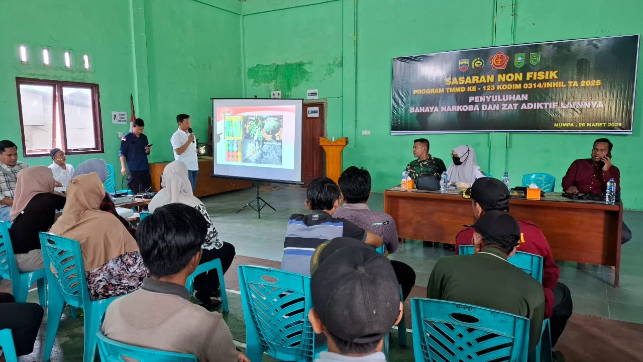 Kabarmedianews.com-INHIL Dalam upaya mendukung program TNI Manunggal Membangun Desa (TMMD) ke-123 Tahun Anggaran 2025, Kodim 0314/Inhil bekerja sama dengan Polres Inhil menggelar penyuluhan mengenai bahaya narkoba dan zat adiktif lainnya di Gedung Serba Guna “Tuah Negri”, Desa Mumpa, pada Rabu (26/2/2025).