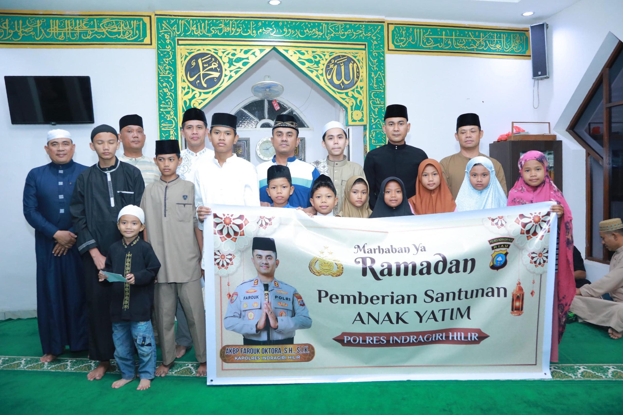 Santunan diberikan usai kegiatan sholat tarawih berjamaah di Masjid Al-Ma’arif Mapolres Inhil Jalan Gajah Mada Tembilahan, Jum’at malam (28/2/2025).