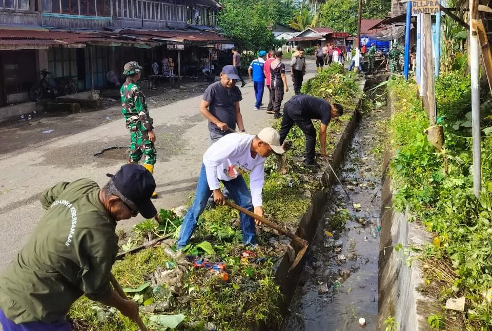 PD. PARIAMAN | Menindaklanjuti laporan warga terkait saluran yang tersumbat di Pasar Ampalu, Nagari Lareh Nan Panjang, Kecamatan VII Koto Sungai Sariak, jajaran pemerintahan kecamatan bersama unsur TNI, Polri, dan masyarakat setempat melaksanakan gotong royong membersihkan saluran tersebut, Rabu (24/4/2025).