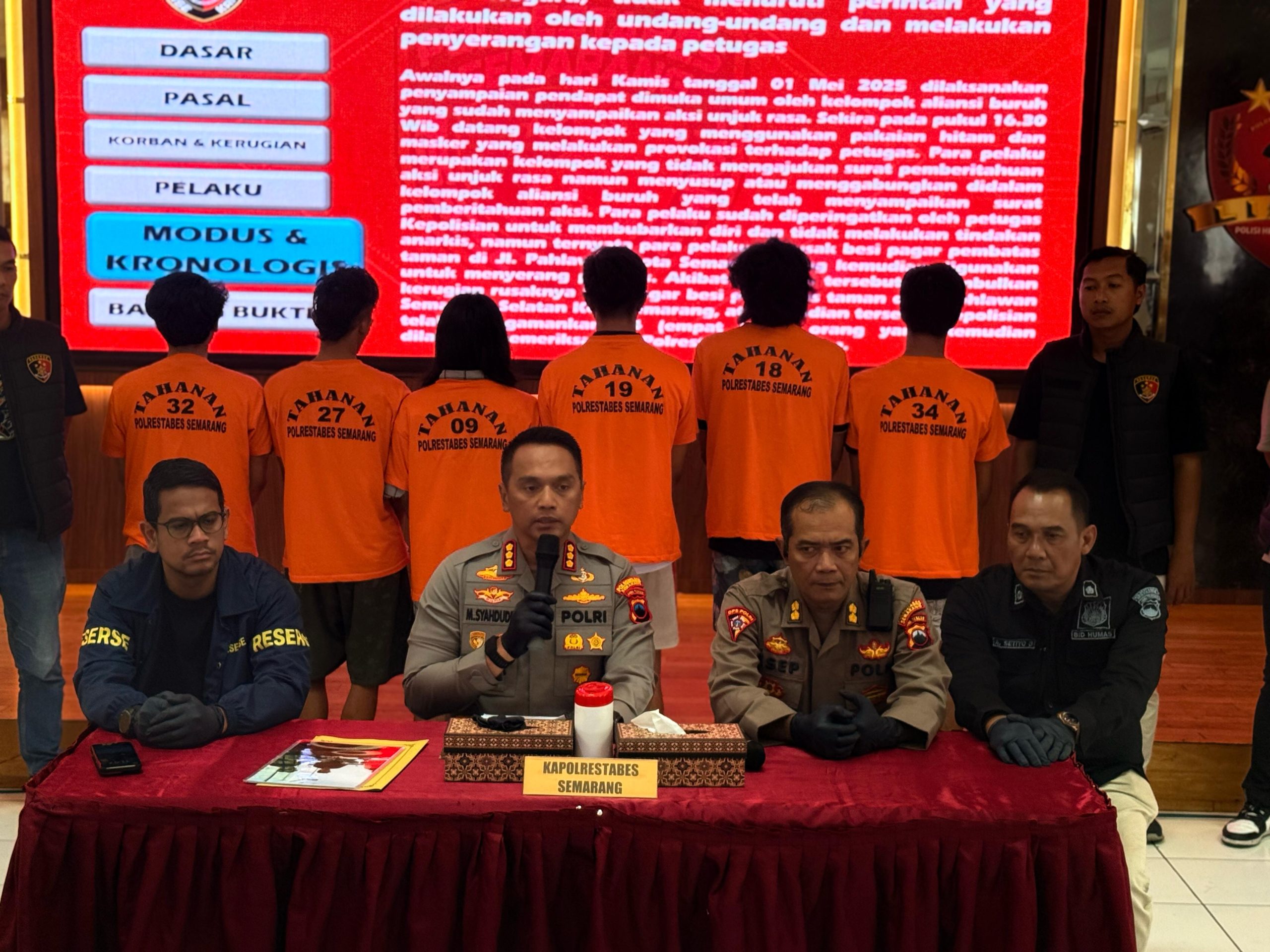 “Ada enam orang kita tetapkan sebagai tersangka. Semuanya memenuhi dua alat bukti, dan unsurnya memenuhi dalam pelanggaran pasal 214 sub 170 KUHP, mereka memiliki peran yang berbeda-beda dalam melakukan aksi anarkis tersebut, ada yang menyusun rencana untuk membuat aksi unjuk rasa berakhir rusuh termasuk penggunaan pakaian berwarna hitam, ada yang merusak fasilitas umum, melempar petugas pengamanan dengan batu, kayu dan benda lain serta melakukan aksi lain yang membahayakan dan melukai petugas”, ungkap Syahduddi di Mapolrestabes Semarang, Sabtu (4/5).