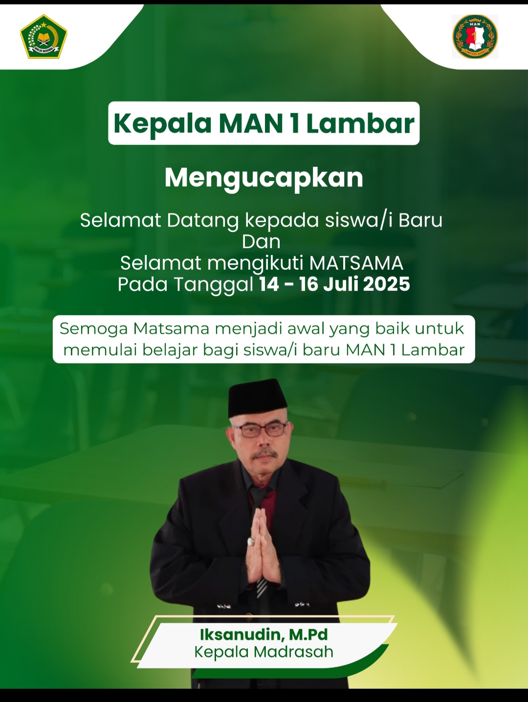Kepela MAN 1 Liwa Ikhsanuddin Ucapkan Selamat Datang Siswa/siswi Baru Dan Selamat Mengikuti MATSAMA Pada Tanggal 14 – 16 Juli di 025