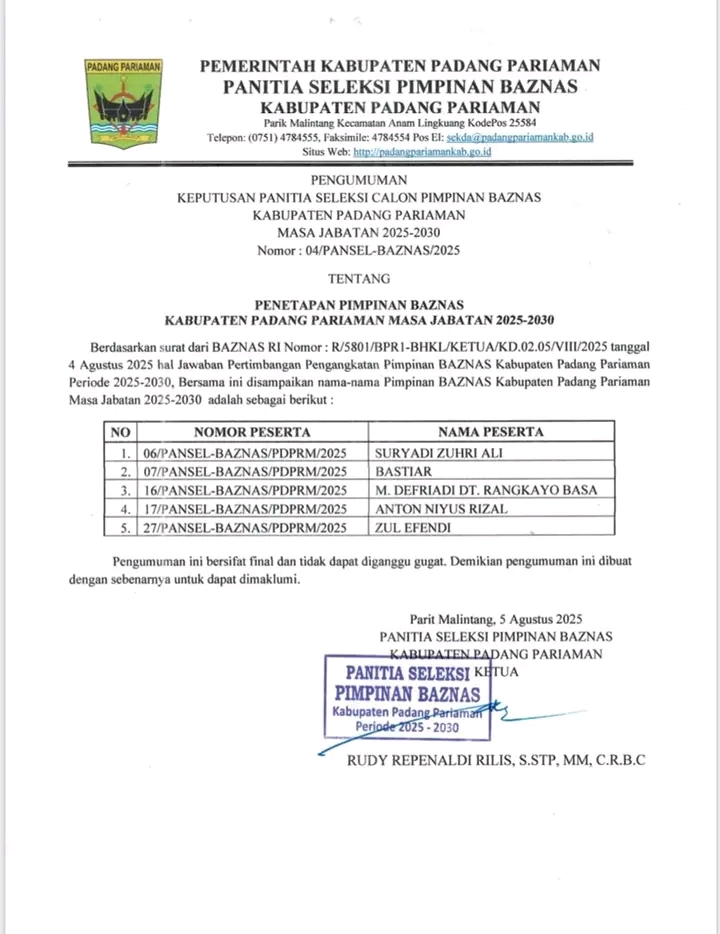 Parit Malintang, 5 Agustus 2025 | Setelah melewati rangkaian tahapan seleksi yang ketat dan profesional, Panitia Seleksi (Pansel) Calon Pimpinan Badan Amil Zakat Nasional (BAZNAS) Kabupaten Padang Pariaman secara resmi menetapkan lima nama sebagai Pimpinan BAZNAS masa jabatan 2025–2030.