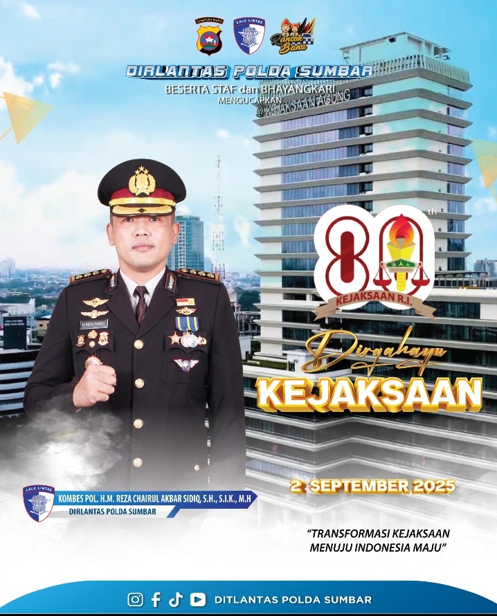 Padang, Sumbar | Momentum peringatan Hari Bhakti Adhyaksa (HBA) ke-80 yang jatuh pada 2 September 2025, menjadi momen penting untuk mempererat sinergi antar-aparat penegak hukum di Indonesia. Salah satu yang memberikan atensi khusus adalah Direktur Lalu Lintas (Dirlantas) Polda Sumatera Barat, Kombes Pol H.M. Reza Chairul Akbar Sidiq, S.H., S.I.K., M.H, Selasa 02 September 2025.