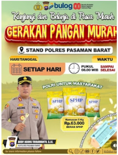 Program ini dilaksanakan setiap hari di stand Polres Pasaman Barat sejak pukul 08.00 WIB hingga selesai. Dengan hanya membawa KTP atau Kartu Keluarga, masyarakat bisa membeli beras SPHP Bulog dengan harga terjangkau Rp63.000 per kemasan 5 kilogram. Untuk pemerataan, setiap orang dibatasi maksimal membeli dua kemasan.