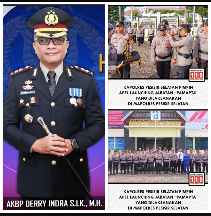 PESISIR SELATAN | Langkah nyata dalam memperkuat pelayanan publik kembali dilakukan Polres Pesisir Selatan. Di bawah kepemimpinan Kapolres Pesisir Selatan AKBP Derry Indra, S.I.K., M.H., jajaran kepolisian meluncurkan jabatan baru bernama Perwira Pengawas dan Penyelidik Pertama (Pamapta), Sabtu 18 Oktober 2025 di halaman Mapolres setempat.