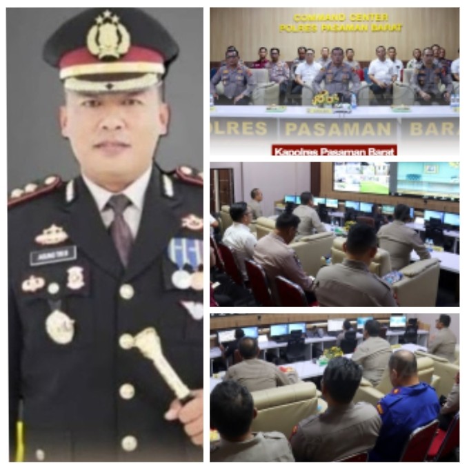 Suasana Command Center Polres Pasaman Barat terlihat serius namun penuh semangat. Layar monitor menampilkan arahan langsung dari Wakapolri dan pejabat utama Mabes Polri, sementara AKBP Agung Tribawanto duduk di barisan depan memimpin jalannya koordinasi bersama para pejabat utama Polres.