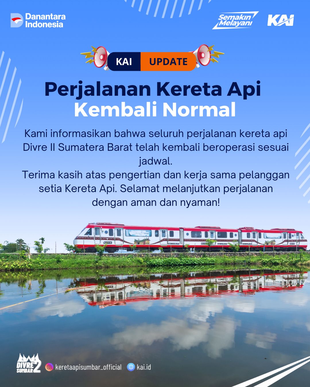 Rilis ini dipublikasikan untuk memberikan informasi mengenai perkembangan operasional perkeretaapian di Sumatera Barat. Pengguna diimbau tetap mematuhi aturan keselamatan selama berada di area stasiun maupun dalam perjalanan.