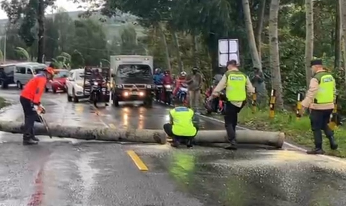 “Kami langsung melakukan pengaturan arus lalu lintas dan bersama tim gabungan melakukan pemotongan batang pohon yang menutupi badan jalan agar akses masyarakat tidak terhambat terlalu lama,” ujar IPTU Ibnu Anwar di lokasi kejadian.
