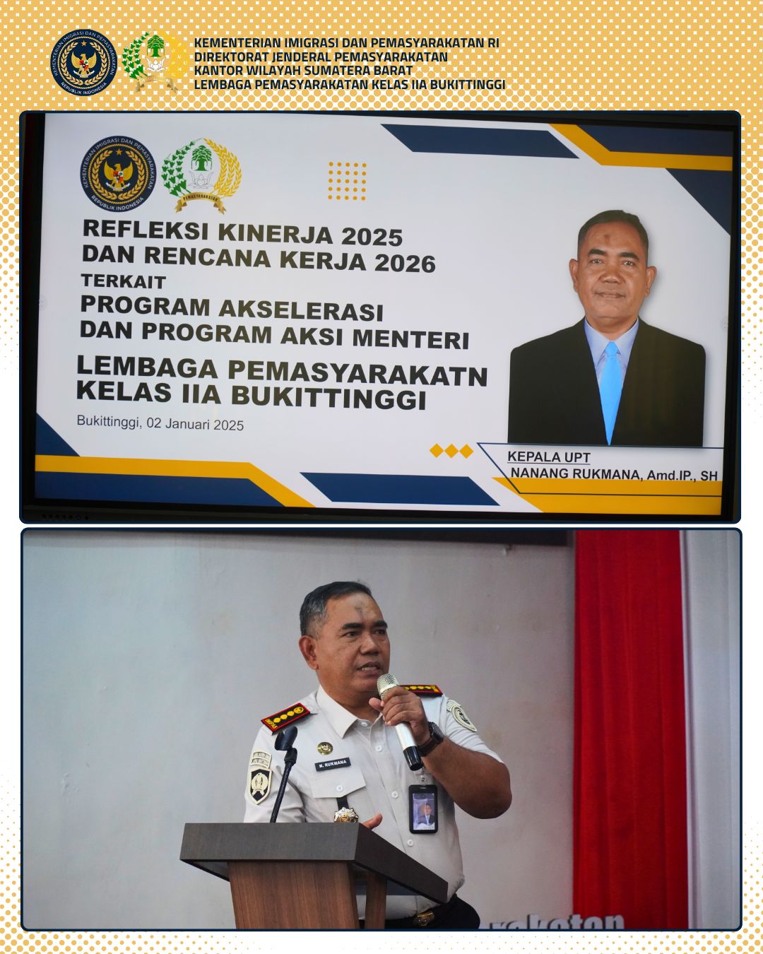 Selain itu, Kalapas Bukittinggi juga memaparkan rencana kerja Tahun 2026 yang selaras dengan Aksi Kemenimipas, dengan menitikberatkan pada inovasi layanan pemasyarakatan, penguatan integritas aparatur, serta sinergi lintas sektor guna mewujudkan pemasyarakatan yang profesional, humanis, dan berorientasi pada pelayanan publik.