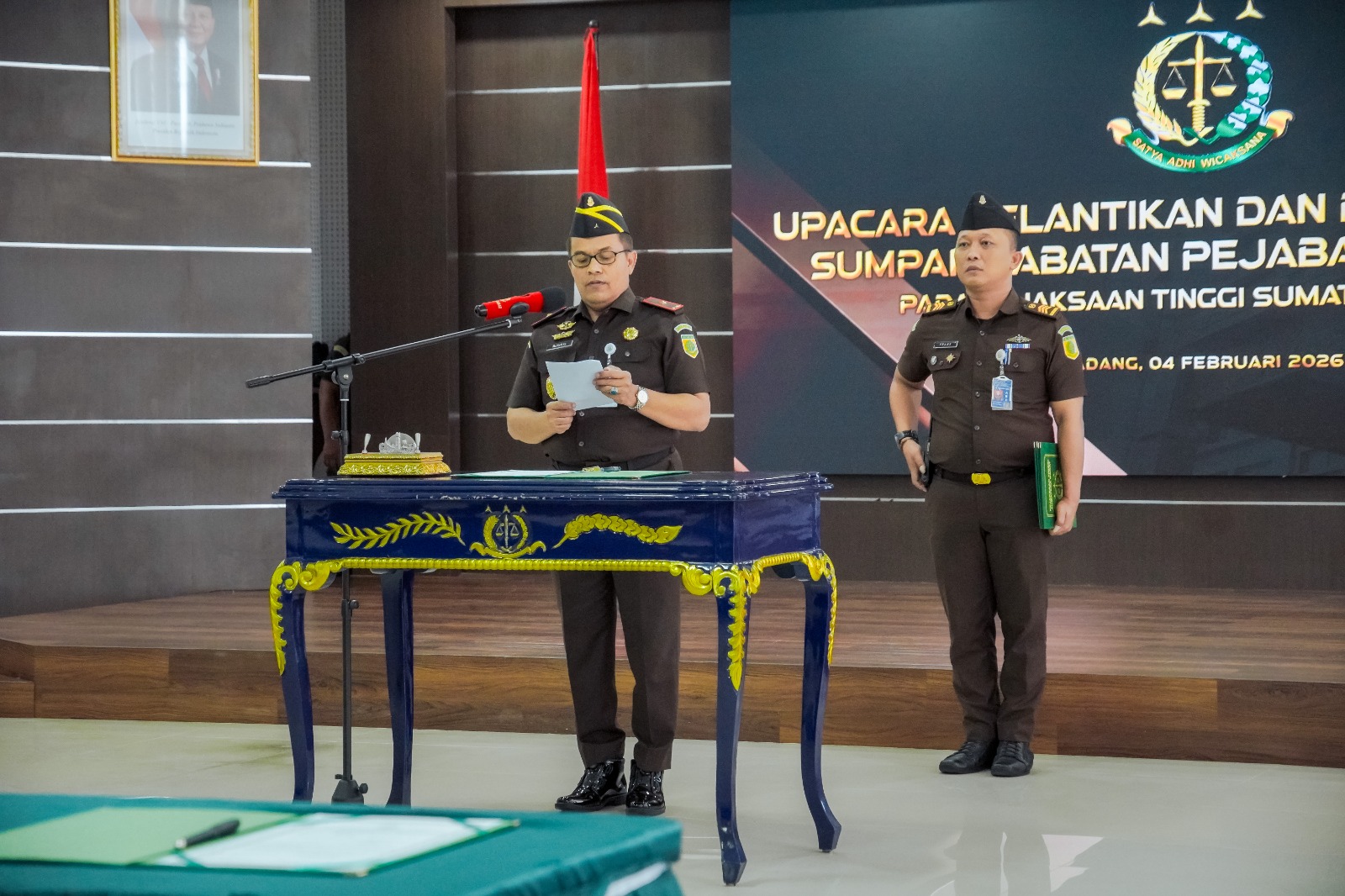 KEJATI SUMBAR | Aula Lantai 5 Kejaksaan Tinggi Sumatera Barat, Rabu 4 Februari 2026, menjadi tempat berlangsungnya pelantikan dan pengambilan sumpah jabatan Pejabat Struktural Eselon IV di lingkungan Kejati Sumbar. Prosesi berjalan khidmat dan tertib, dipimpin langsung Wakil Kepala Kejaksaan Tinggi Sumatera Barat, Dr. Mukhlis, S.H., M.H.