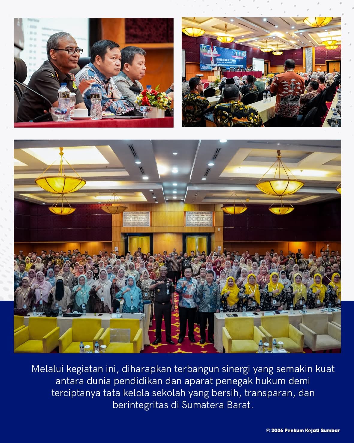 SUMBAR | Di tengah dinamika pengelolaan pendidikan yang semakin kompleks, Kepala Kejaksaan Tinggi Sumatera Barat, Muhibuddin, S.H., M.H., tampil membawa pesan yang menenangkan sekaligus menguatkan. Dalam forum Bimbingan Teknis Kepala SMA se-Sumatera Barat yang digelar di Grand Basko Hotel Padang, Kamis, 12 Februari 2026, ia hadir bukan sekadar sebagai narasumber, tetapi sebagai jembatan kepercayaan antara hukum dan dunia pendidikan.