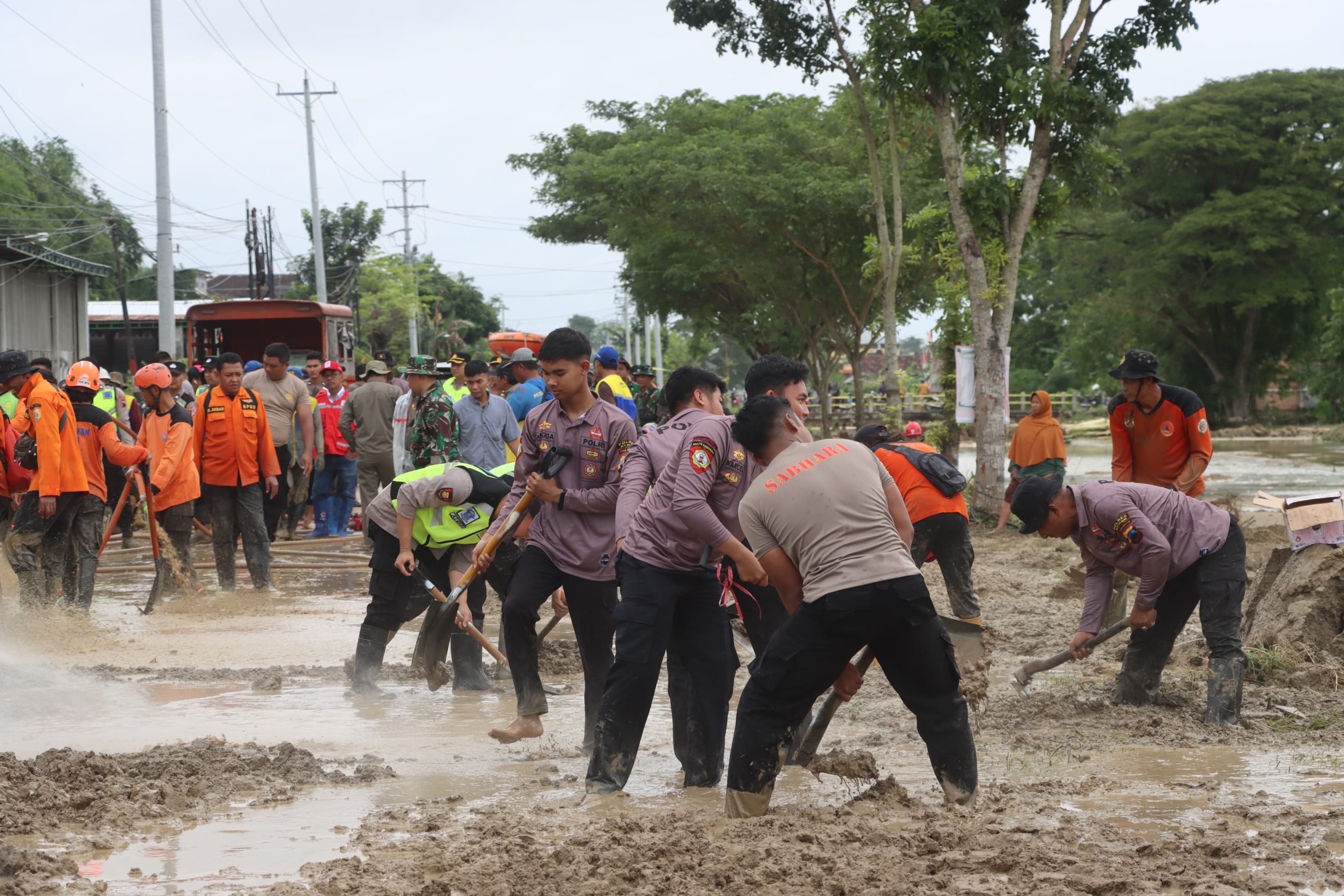 Personel gabungan TNI, Polri, BPBD, PMI bersama masyarakat juga melakukan kerja bakti membersihkan lumpur yang menutup badan jalan guna mempercepat pemulihan akses transportasi.