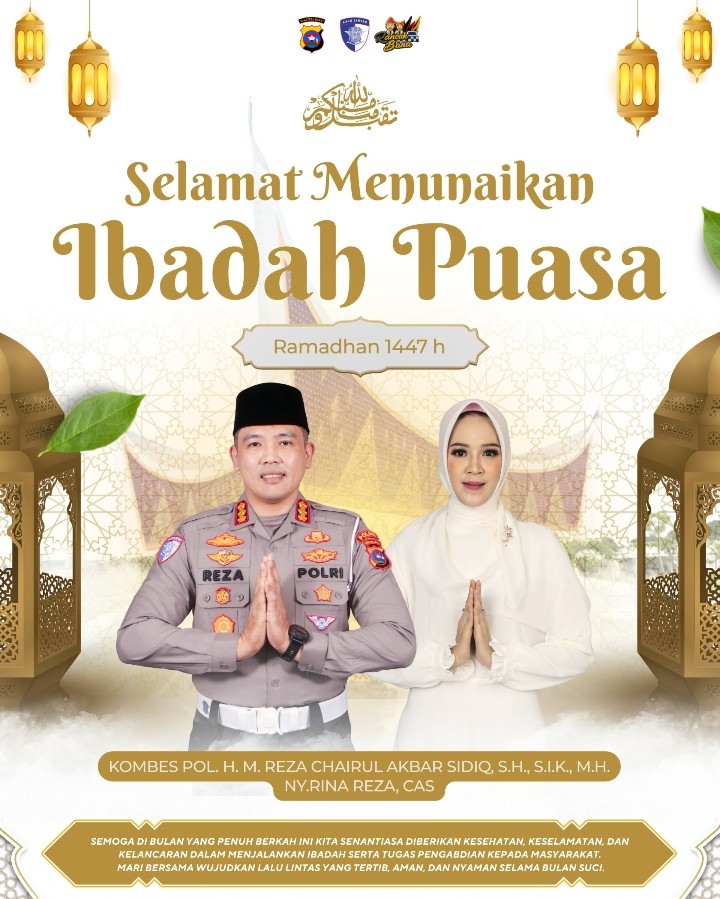SUMBAR | Menyambut datangnya bulan suci Ramadhan 1447 Hijriah, suasana religius dan penuh harap menyelimuti Sumatera Barat. Di tengah semangat memperbaiki diri dan memperkuat keimanan, Direktur Lalu Lintas Polda Sumatera Barat, Kombes Pol. H. M. Reza Chairul Akbar Sidiq, S.H., S.I.K., M.H., menyampaikan ucapan selamat menunaikan ibadah puasa kepada seluruh masyarakat.