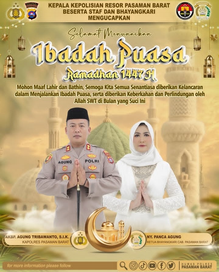 PASAMAN BARAT | Datangnya bulan suci Ramadan 1447 Hijriah membawa nuansa haru dan harapan bagi masyarakat Pasaman Barat. Di tengah semangat menyambut bulan penuh ampunan itu, Kepala Kepolisian Resor Pasaman Barat AKBP Agung Tribawanto, S.I.K., bersama Ketua Bhayangkari Cabang Pasaman Barat Ny. Panca Agung dan jajaran, menyampaikan ucapan selamat menunaikan ibadah puasa kepada seluruh lapisan masyarakat.