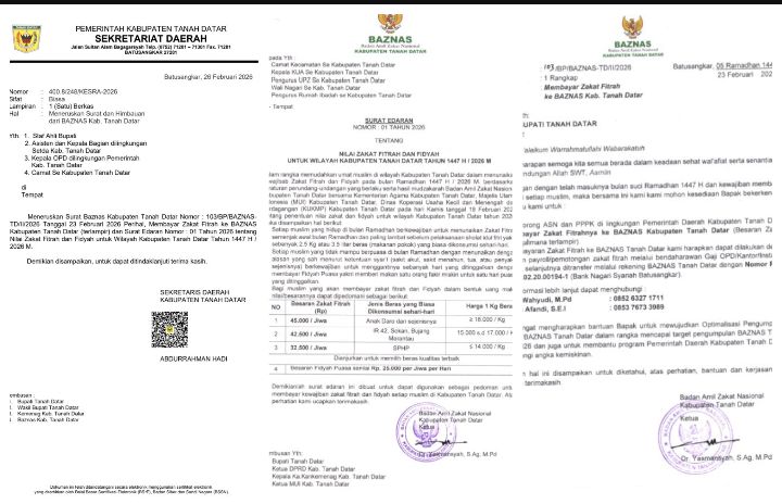 Imbauan tersebut tertuang dalam surat Sekretariat Daerah Kabupaten Tanah Datar Nomor 400.8/248/KESRA-2026 tanggal 26 Februari 2026 yang meneruskan Surat BAZNAS Kabupaten Tanah Datar Nomor: 103/BP/BAZNAS-TD/II/2026 tanggal 23 Februari 2026 tentang pembayaran zakat fitrah melalui BAZNAS serta Surat Edaran Nomor 01 Tahun 2026 tentang Nilai Zakat Fitrah dan Fidyah untuk wilayah Kabupaten Tanah Datar �.