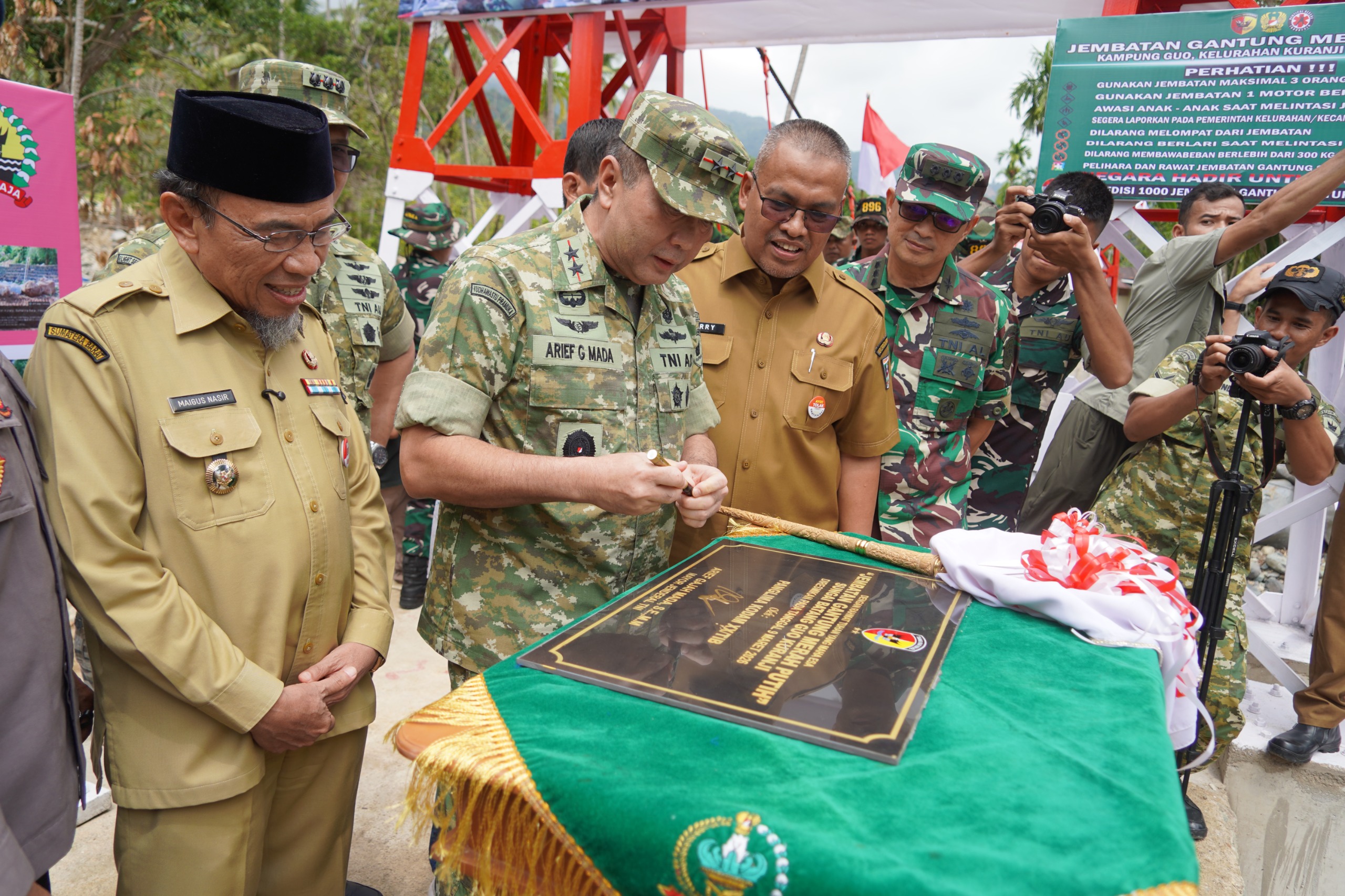 PADANG | Jembatan Gantung Garuda Merah Putih di daerah Guo RT 01/06 kelurahan Kuranji kota Padang yang dikerjakan oleh prajurit TNI AD (Kodam XX/TIB) resmi digunakan. Peresmian dilakukan oleh Presiden RI H, Prabowo Subianto secara daring yang juga di hadiri Kasad, Jenderal TNI Maruli Simanjuntak saat melakukan peresmian secara bersamaan di wilayah Aceh pada Senin 9/3/2026.