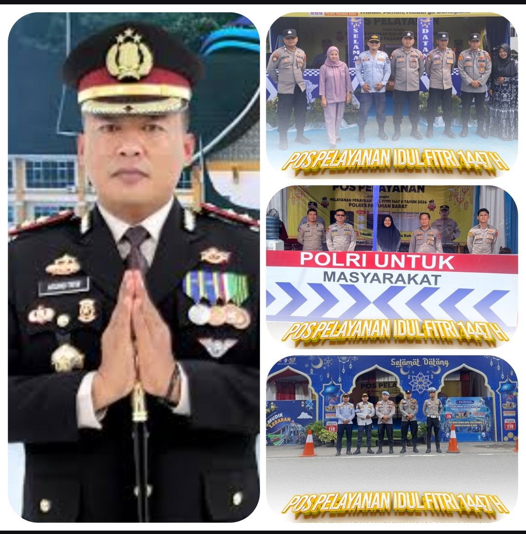 Pasaman Barat | Suasana Pos Pelayanan Idul Fitri 1447 H di wilayah hukum Polres Pasaman Barat tampak penuh semangat dan kesiapsiagaan. Di balik aktivitas tersebut, sosok Kapolres Pasaman Barat, AKBP Agung Tribawanto, S.IK., tampil sebagai figur sentral yang menggerakkan seluruh personel dalam memberikan pelayanan terbaik kepada masyarakat.