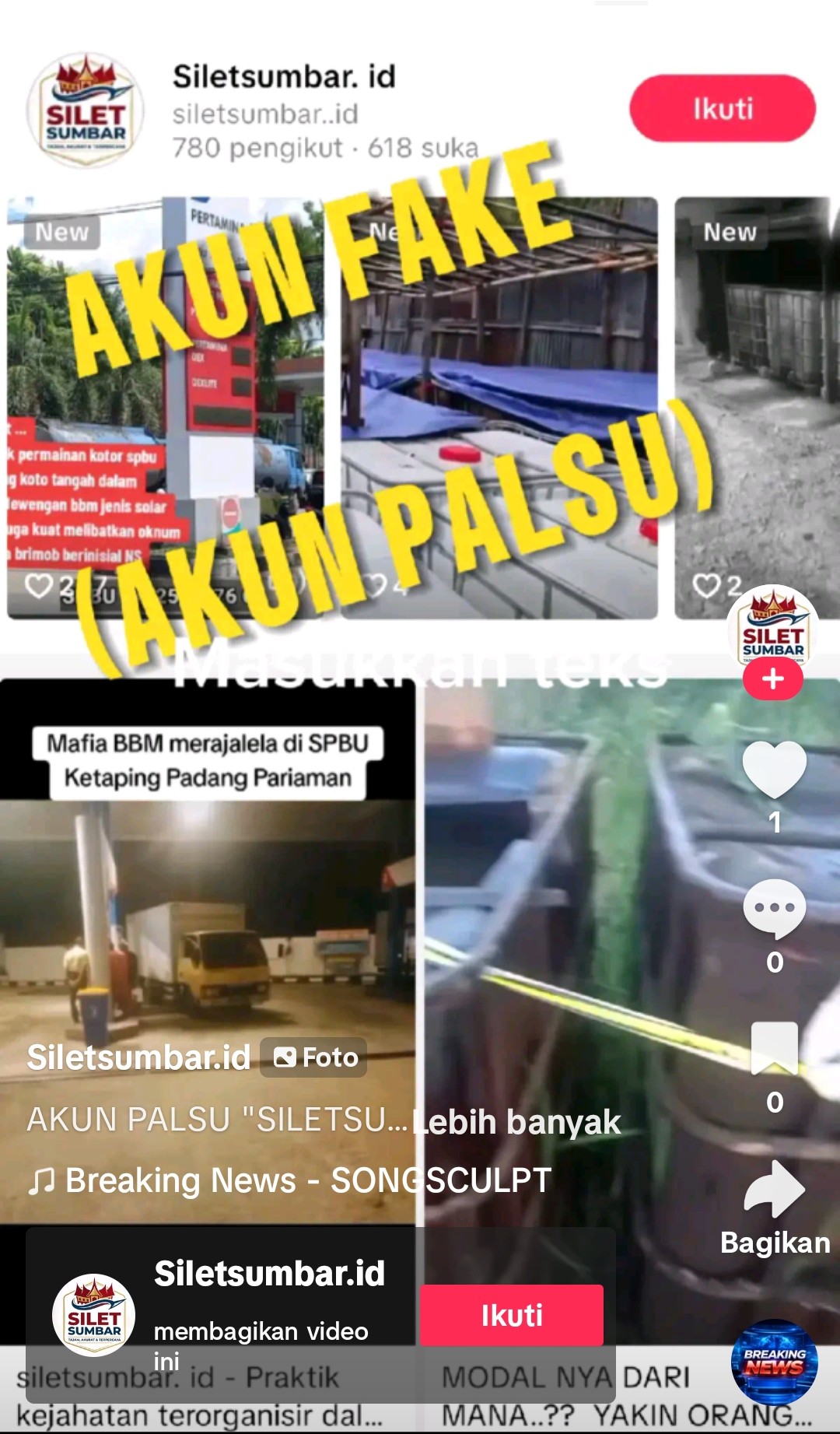 Salah satu modus yang patut diwaspadai adalah akun palsu yang mengatasnamakan “Siletsumbar.id. Dengan cara sederhana namun efektif, pelaku melakukan Copy-Paste video dari akun asli, lalu mengunggah ulang seolah-olah itu milik mereka. Tujuannya jelas, membangun kepercayaan secara instan tanpa perlu bersusah payah membuat konten.